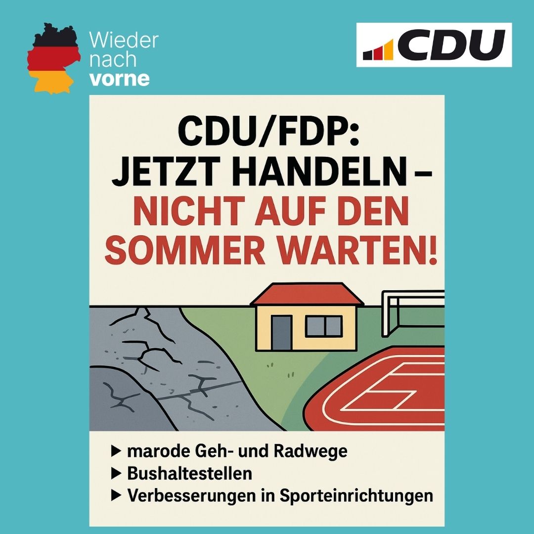 Die CDU/FDP-Fraktion will die von der Bundesregierung bereitgestellten Infrastrukturmittel sofort nutzen, um längst überfällige Arbeiten in unserer Stadt anzugehen: marode Geh- und Radwege, Bushaltestellen Sanierungen …
