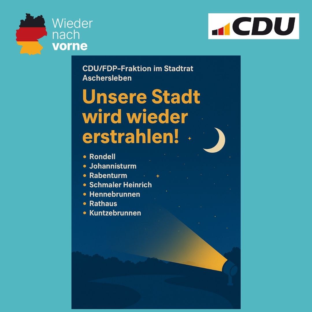 Unsere Stadt wird wieder erstrahlen! Der Stadtrat hat unserem Antrag zugestimmt:Ab dem Haushalt 2026 werden die Mittel für das stundenweise Anstrahlen und Beleuchten wichtiger Ascherslebener …